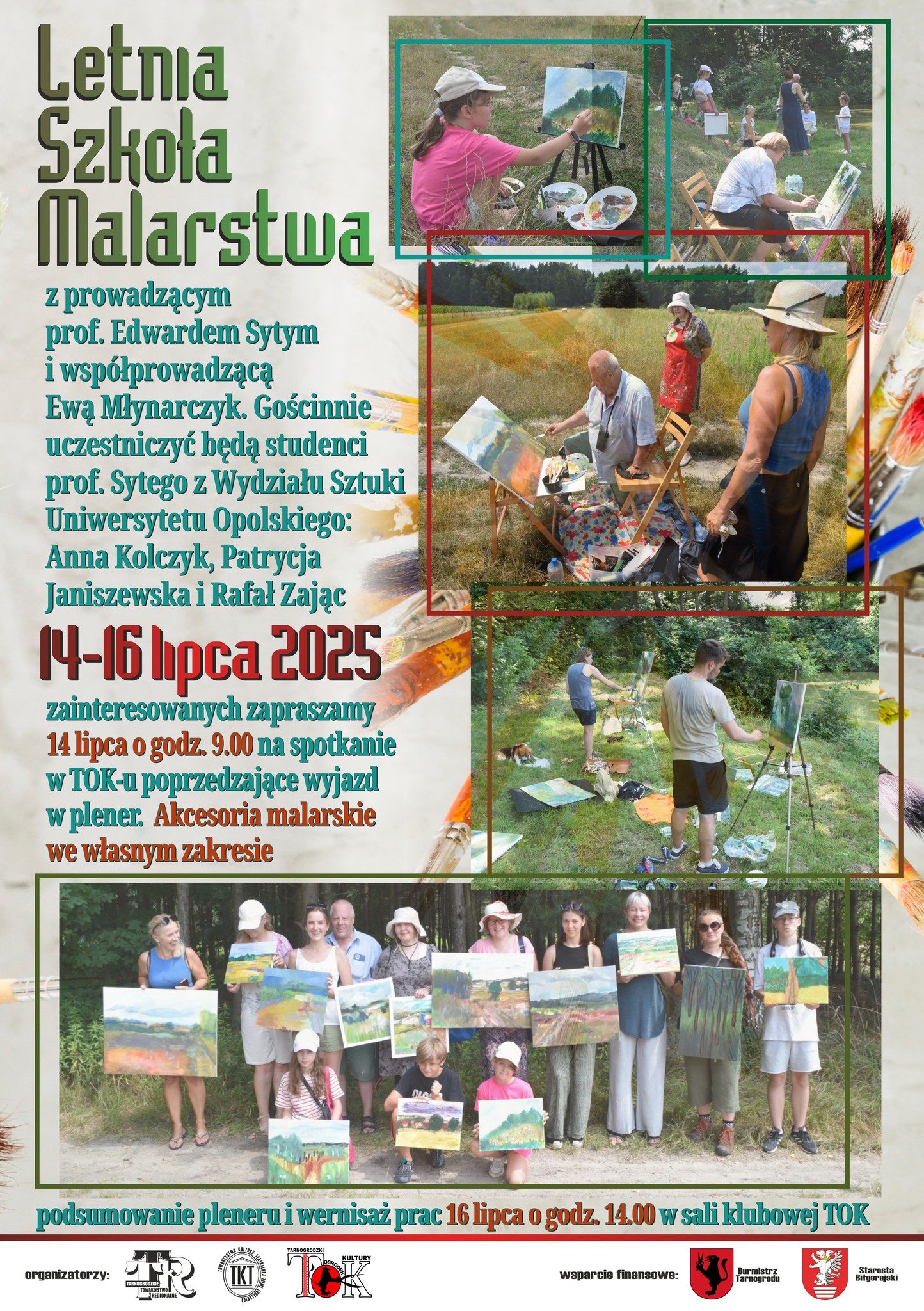 W dniach 14–16 lipca 2025 r. odbędą się coroczne warsztaty malarskie, prowadzone przez prof. Edwarda Sytego oraz współprowadzącą Ewę Młynarczyk. Uczestnicy każdego dnia będą przemierzać okolicę w poszukiwaniu malowniczych, inspirujących pejzaży. To wyjątkowa okazja, by odkryć swój talent malarski i doskonalić umiejętności twórcze pod okiem wybitnego artysty, pochodzącego z Tarnogrodu.