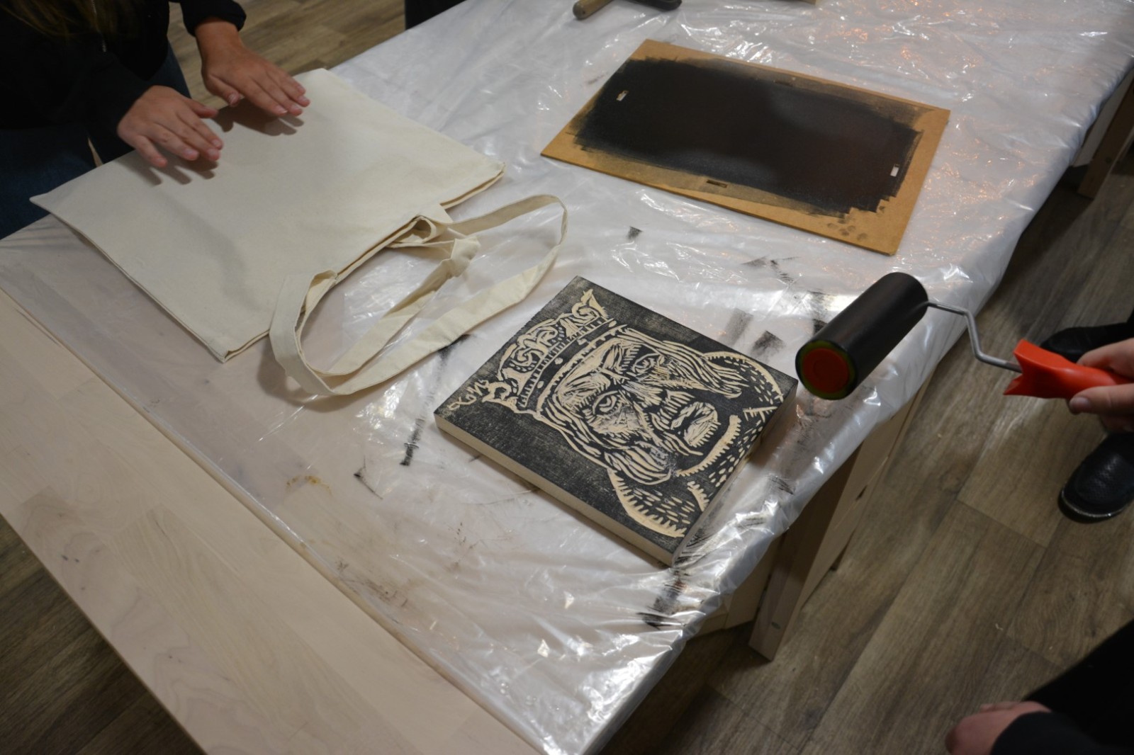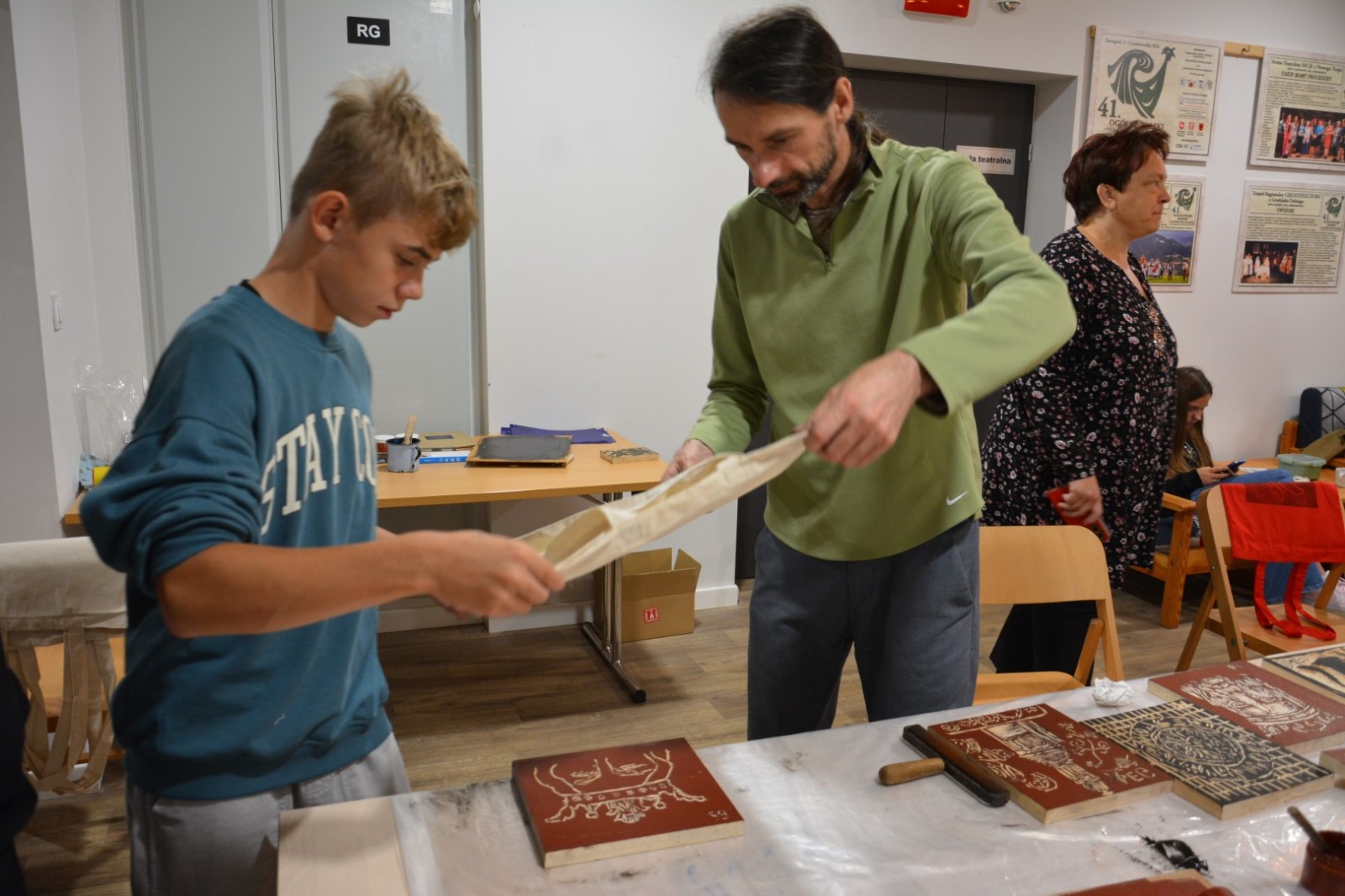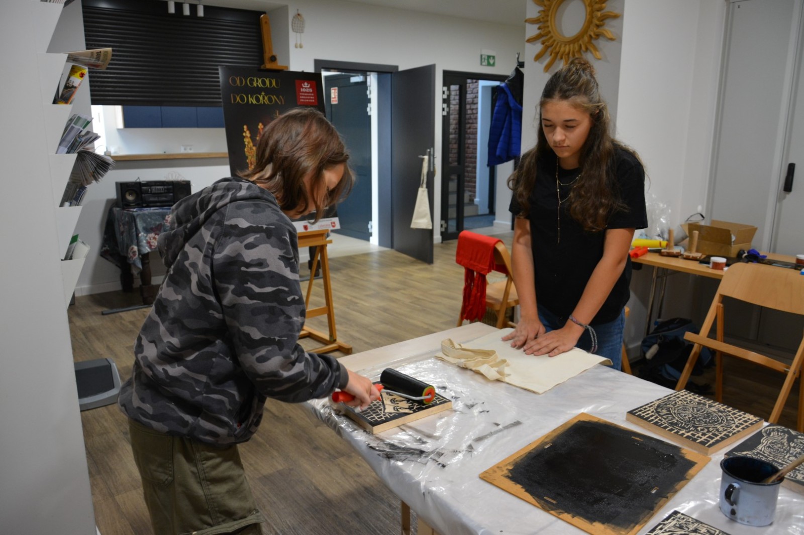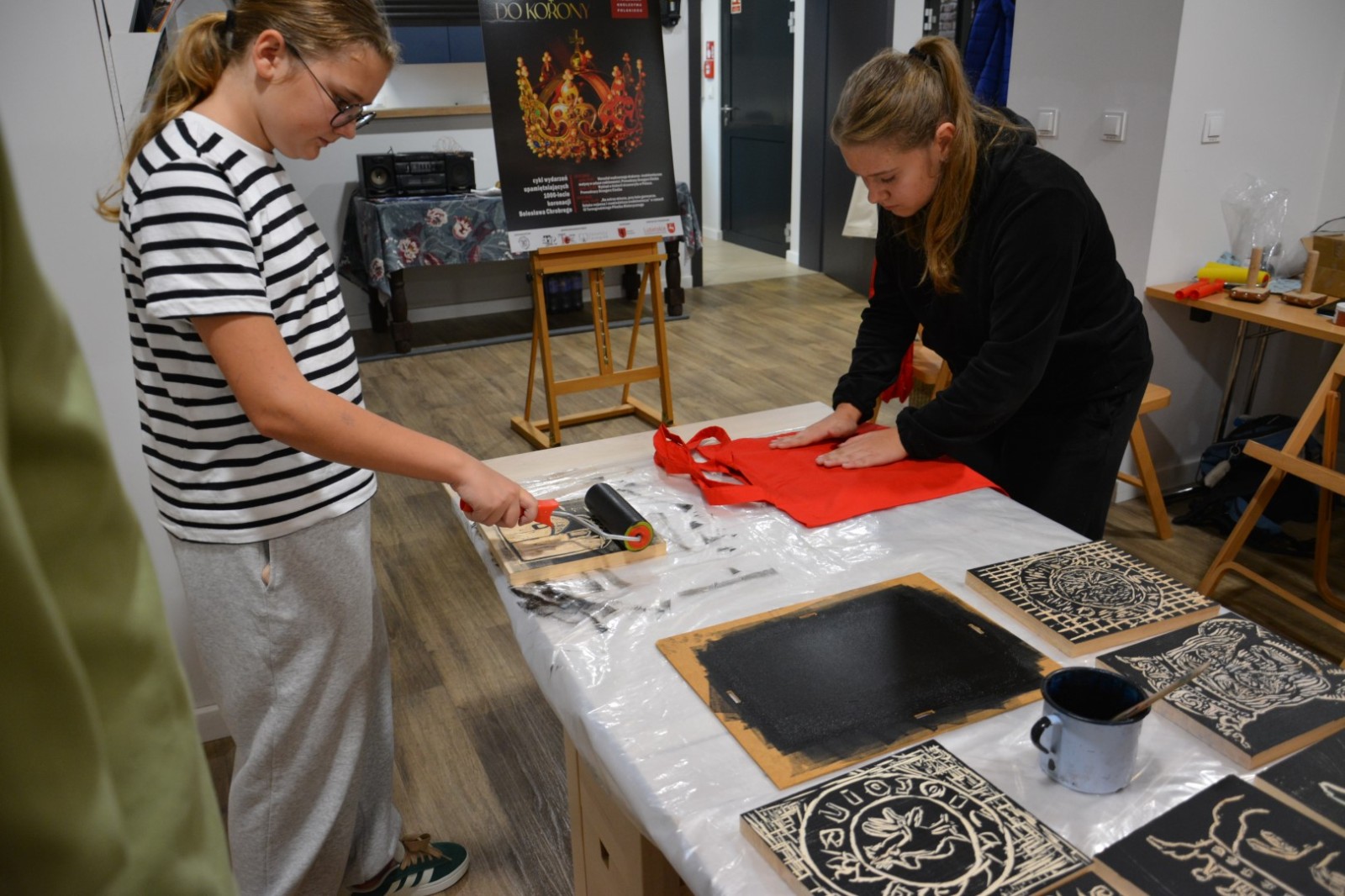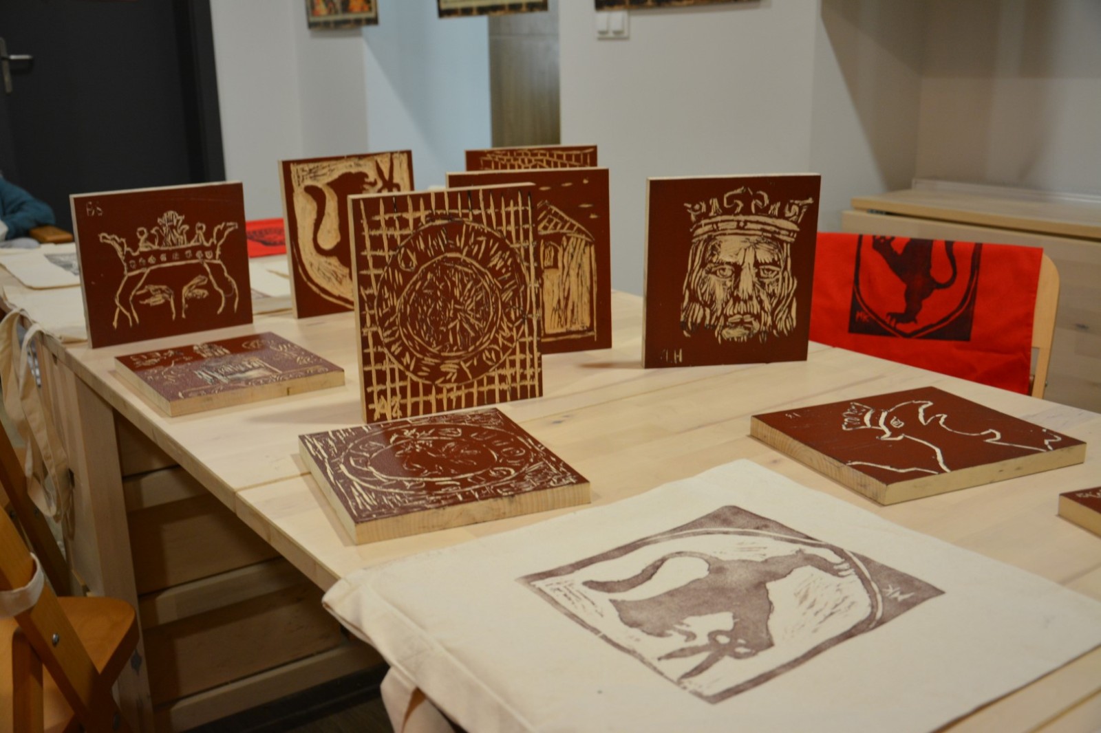 Najpierw podczas kilkugodzinnych warsztatów uczniowie ze SP w Tarnogrodzie samodzielnie wykonali drzeworyty inspirowane średniowiecznymi wzorami, które następnie posłużyły jako matryce do zadruku bawełnianych toreb. Tarnogrodzki Ośrodek Kultury na chwilę zamienił się w tradycyjny warsztat drukarski, a uczestnicy mogli przejść przez każdy etap procesu zadruku tkaniny.