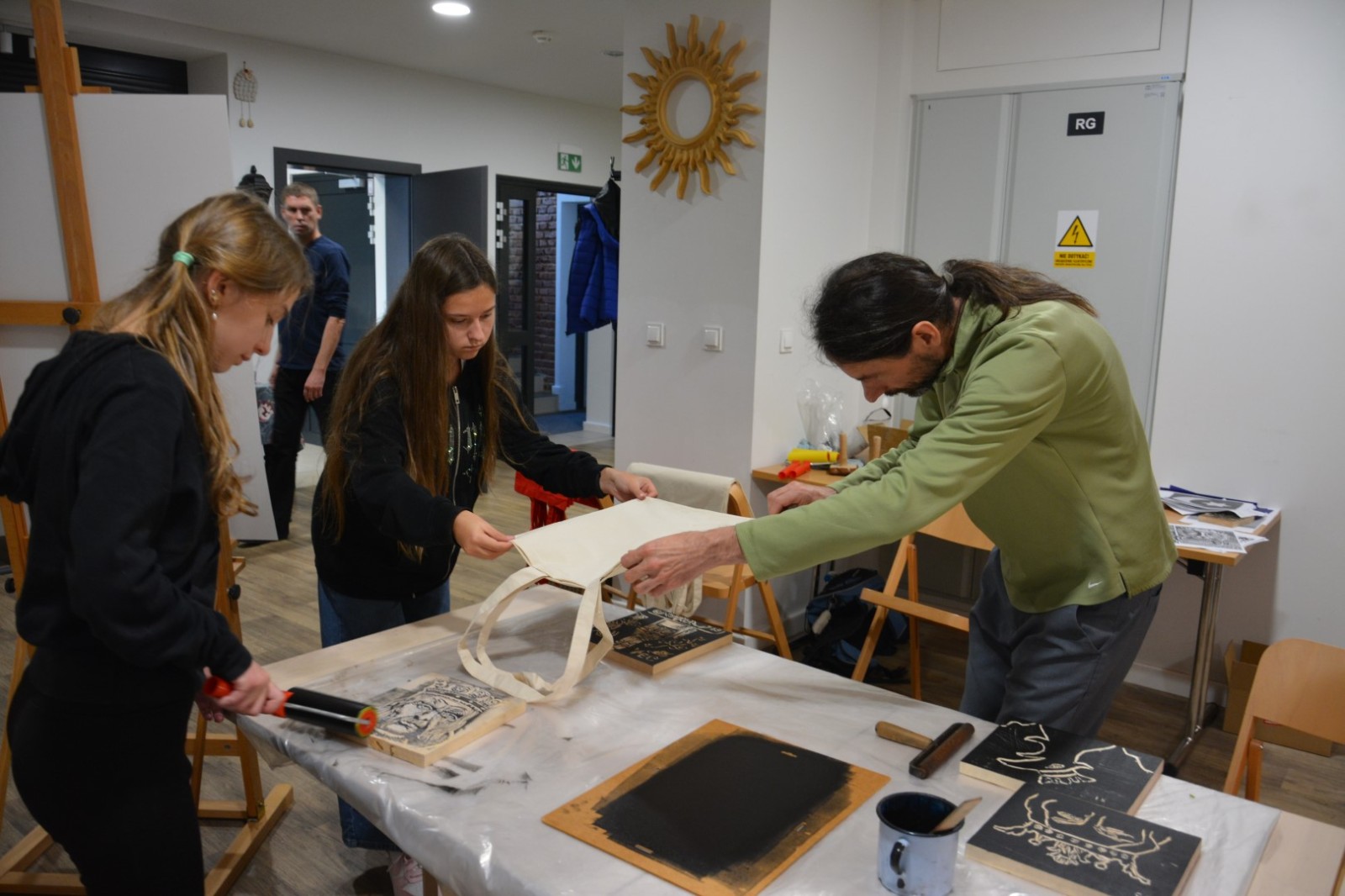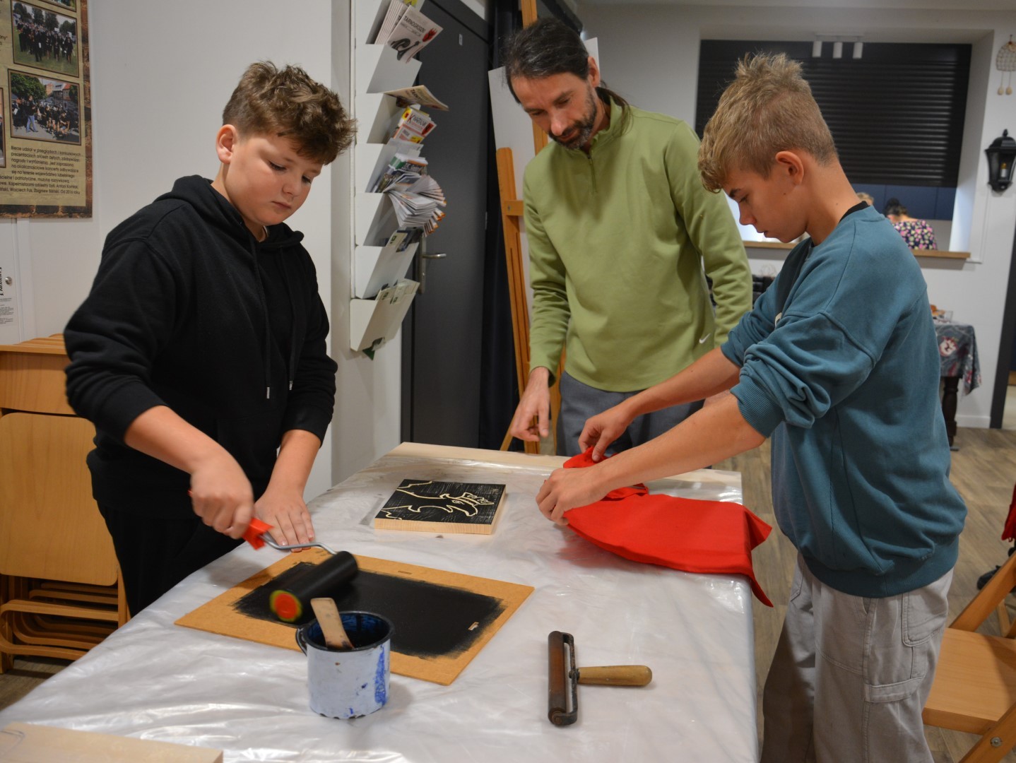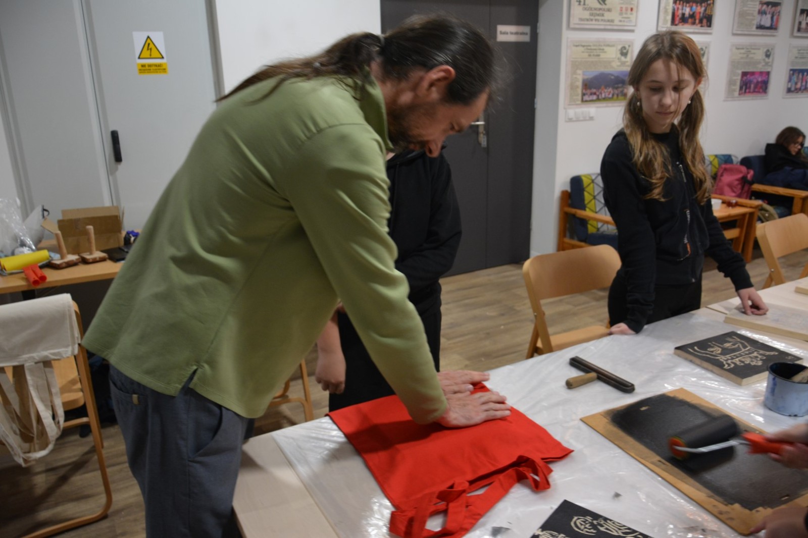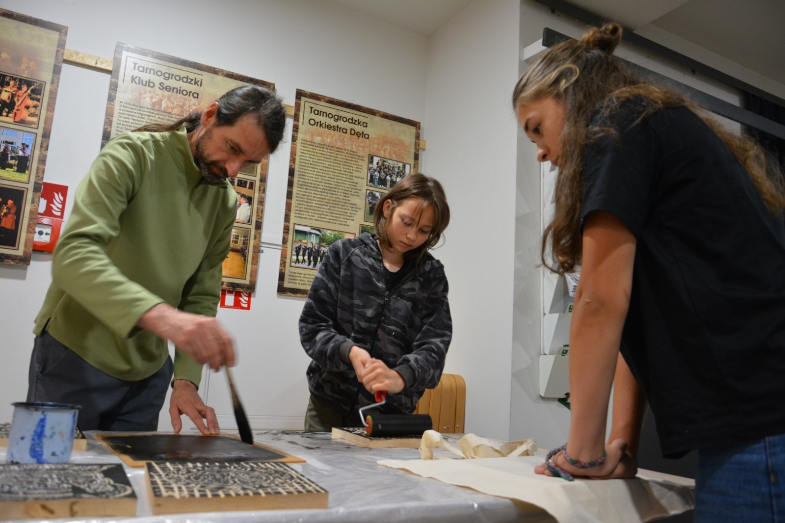 Najpierw podczas kilkugodzinnych warsztatów uczniowie ze SP w Tarnogrodzie samodzielnie wykonali drzeworyty inspirowane średniowiecznymi wzorami, które następnie posłużyły jako matryce do zadruku bawełnianych toreb. Tarnogrodzki Ośrodek Kultury na chwilę zamienił się w tradycyjny warsztat drukarski, a uczestnicy mogli przejść przez każdy etap procesu zadruku tkaniny.