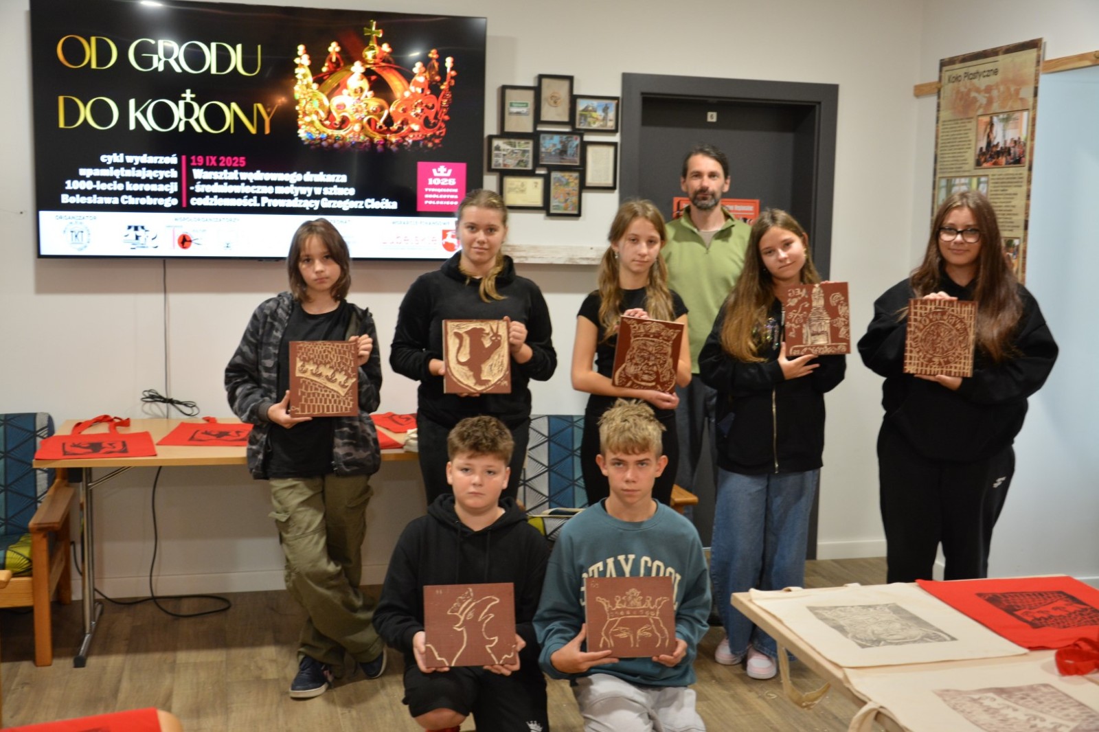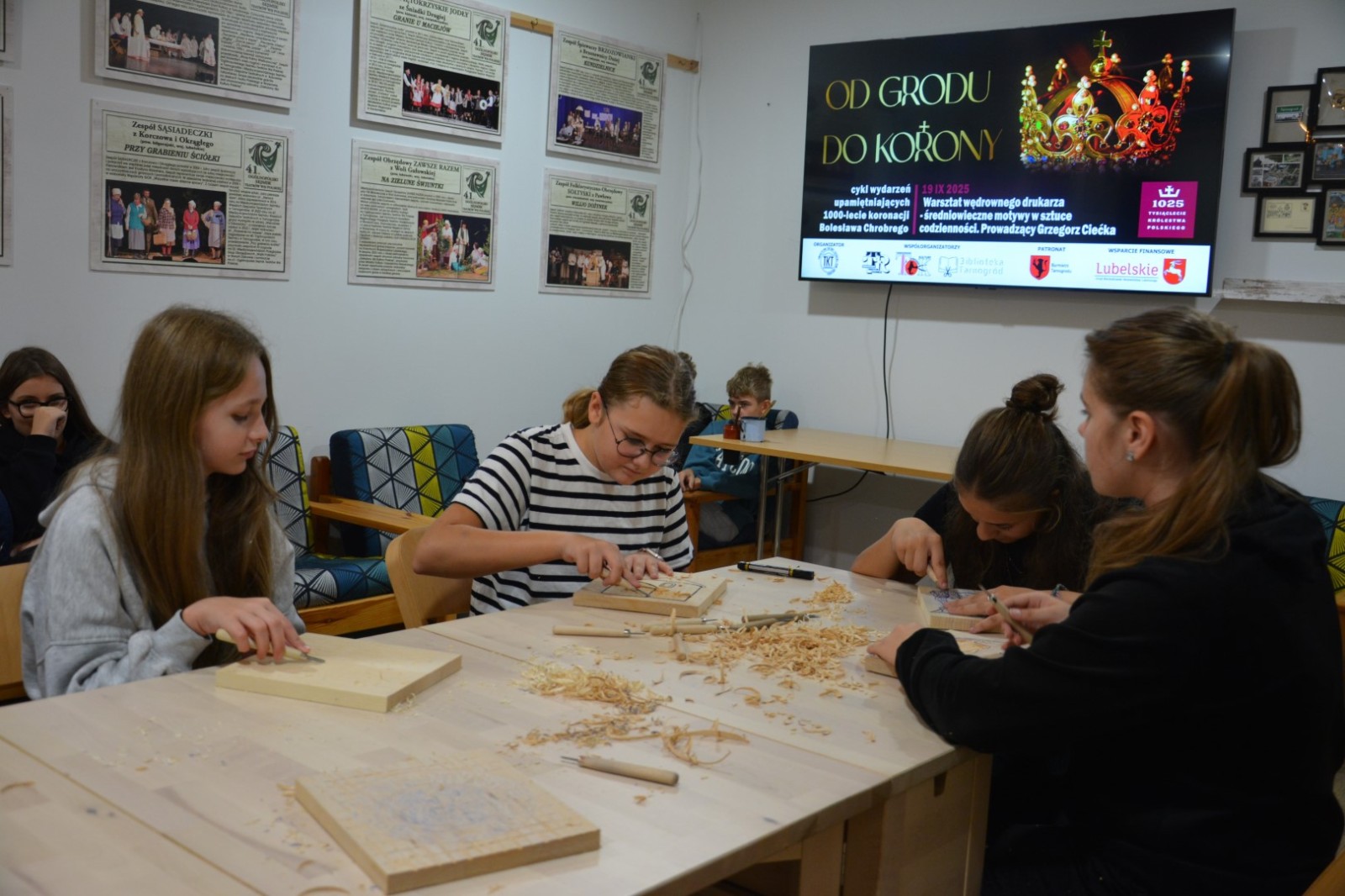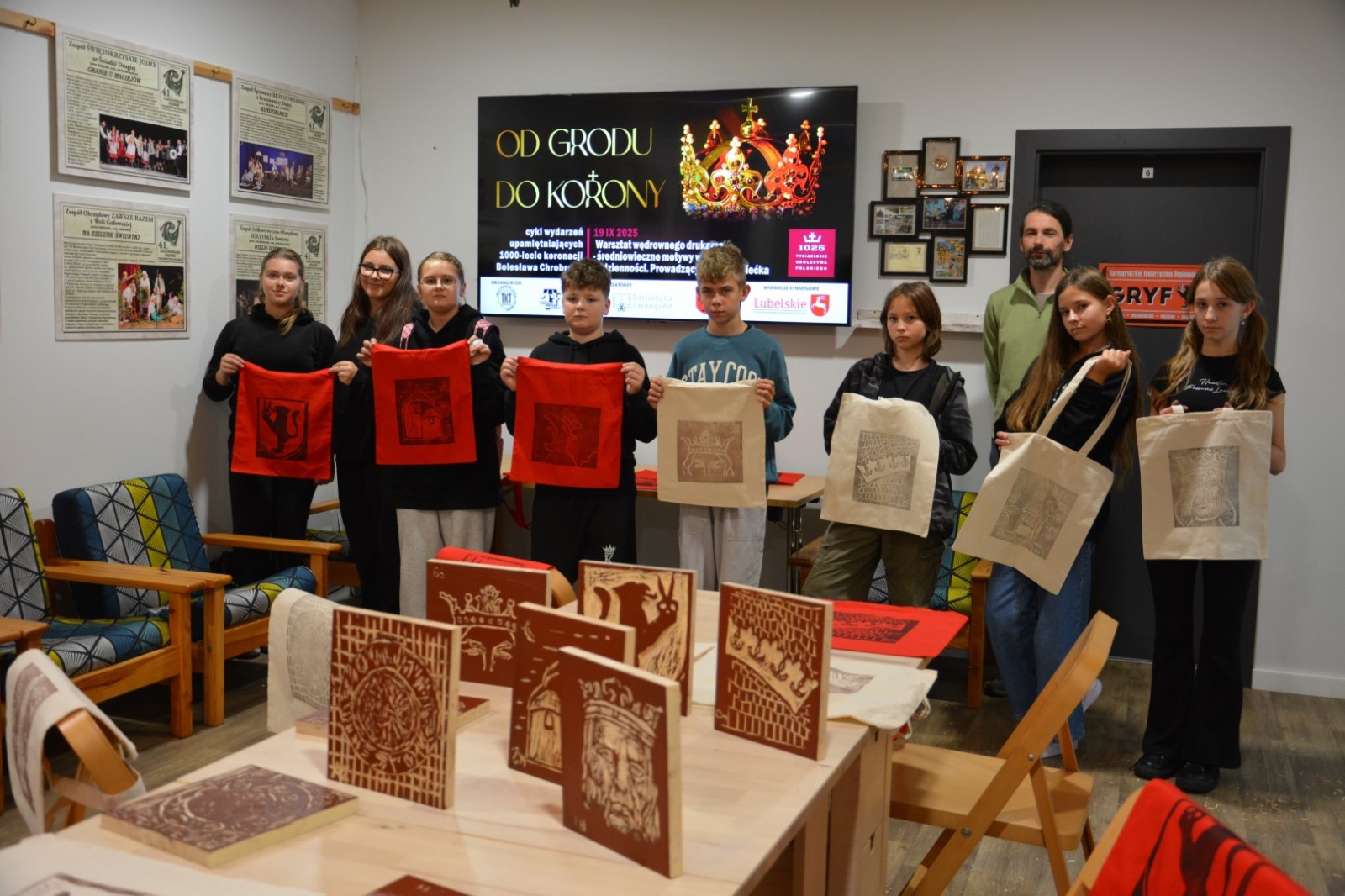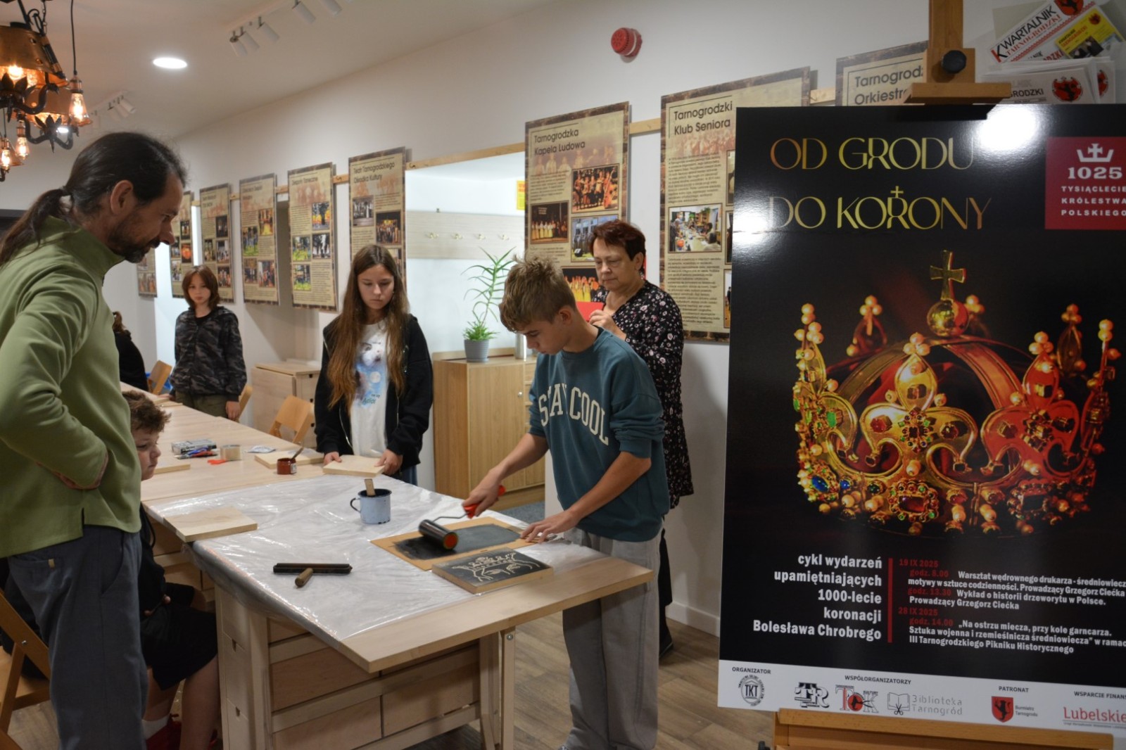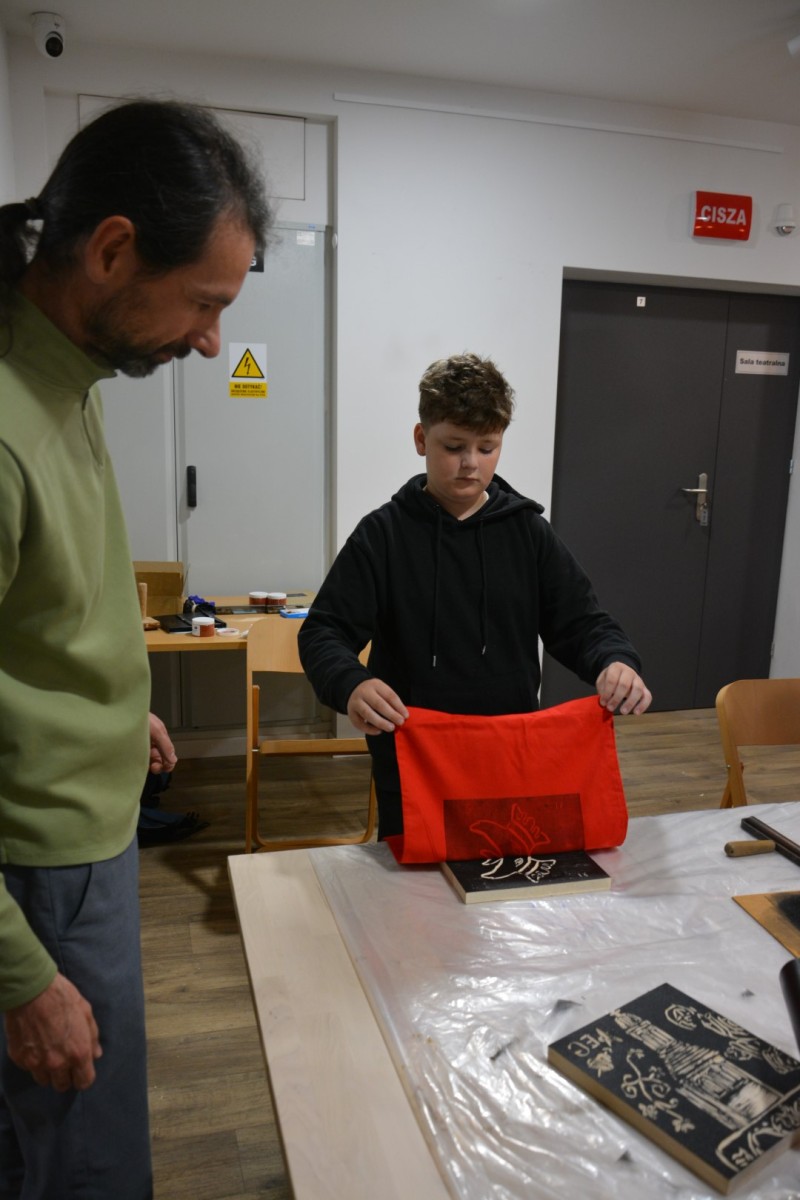 19 września 2025r. Tarnogrodzki Ośrodek Kultury gościł wyjątkowego artystę, Grzegorza Ciećkę, specjalizującego się w drzeworycie ludowym i zadruku tkanin, który zapoznał młodzież z tradycyjną sztuką drzeworytniczą w ramach projektu "1000-lecie koronacji Bolesława Chrobrego"