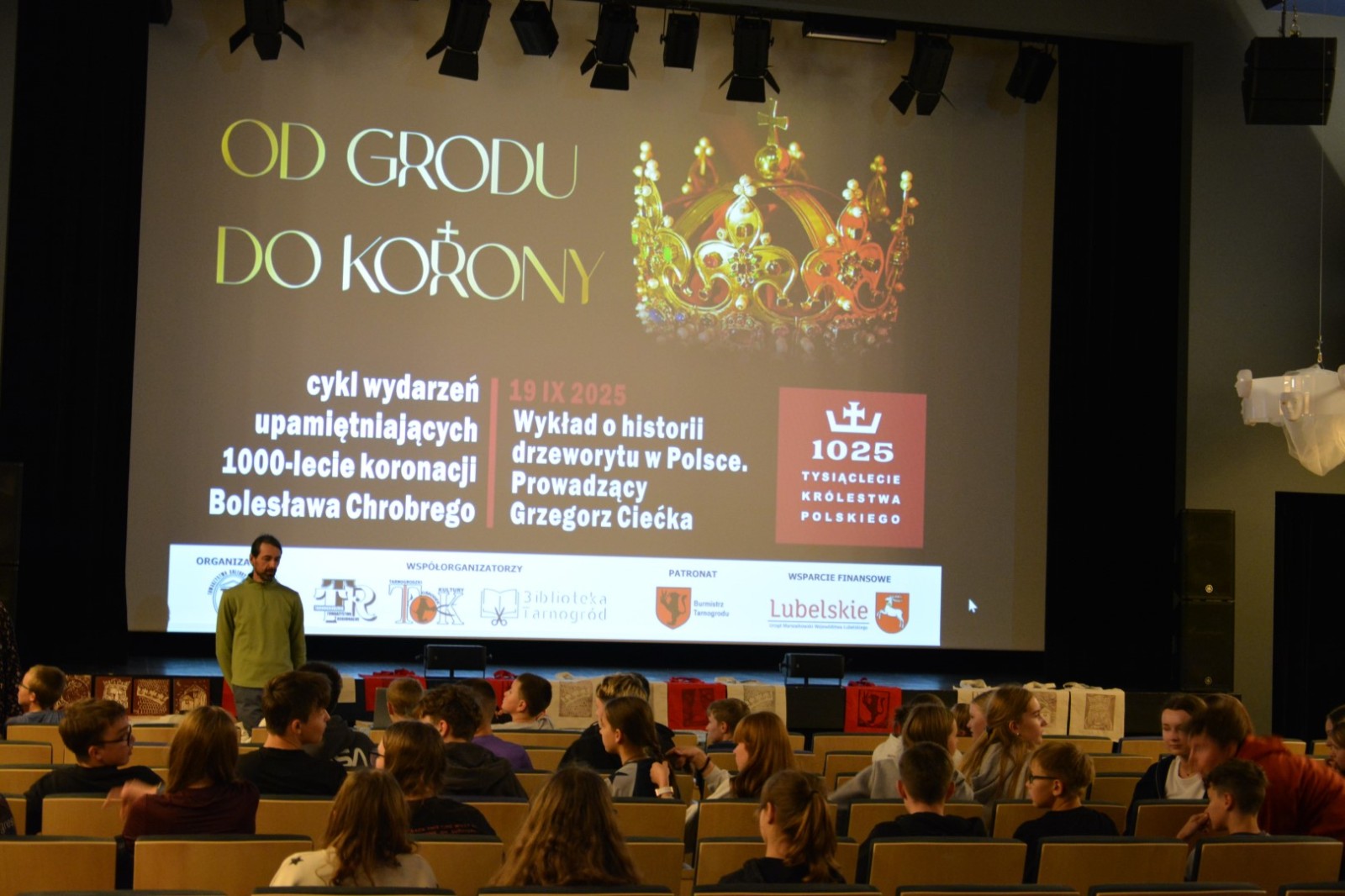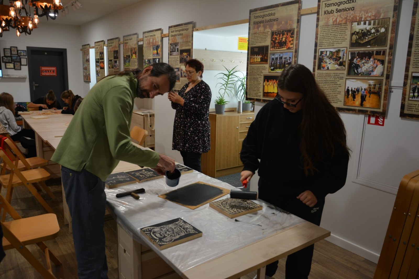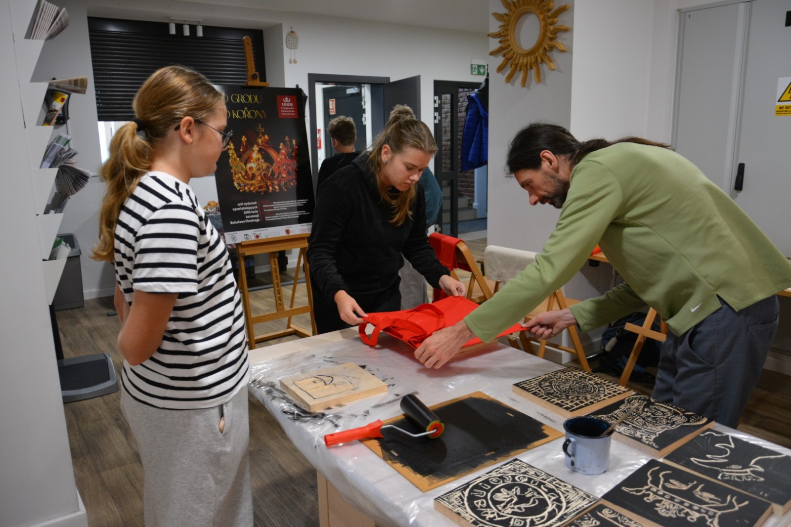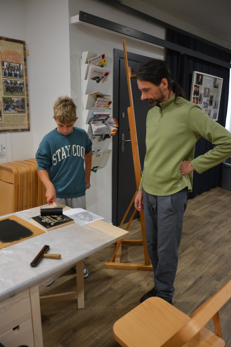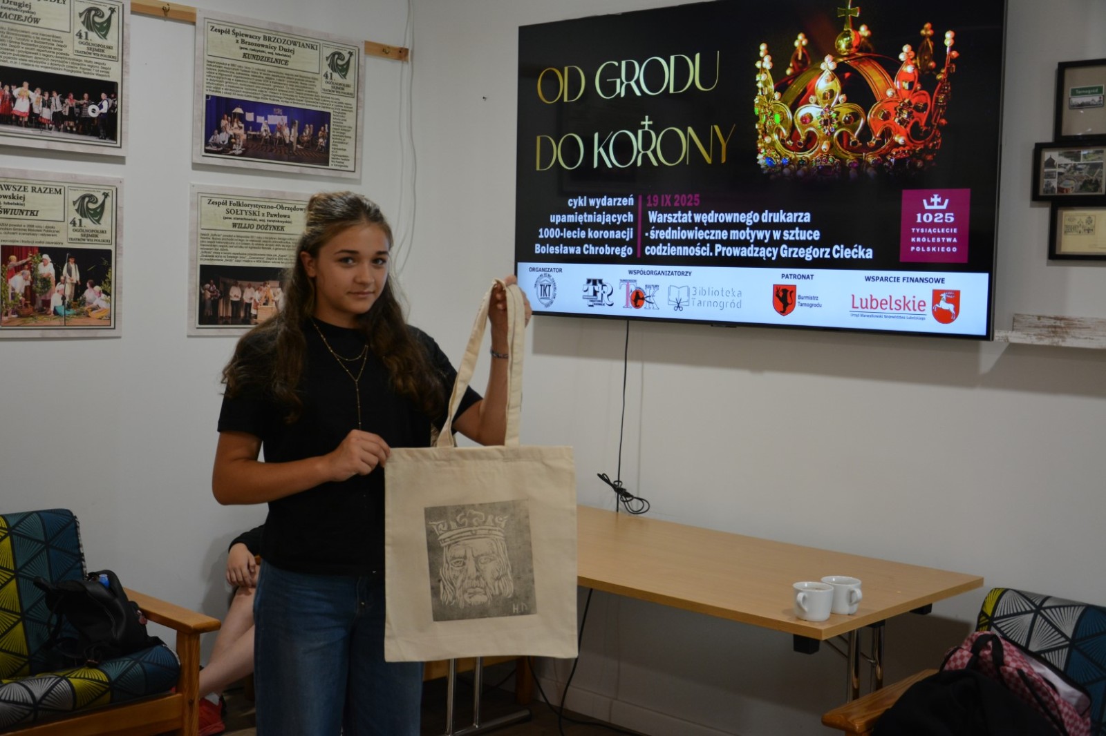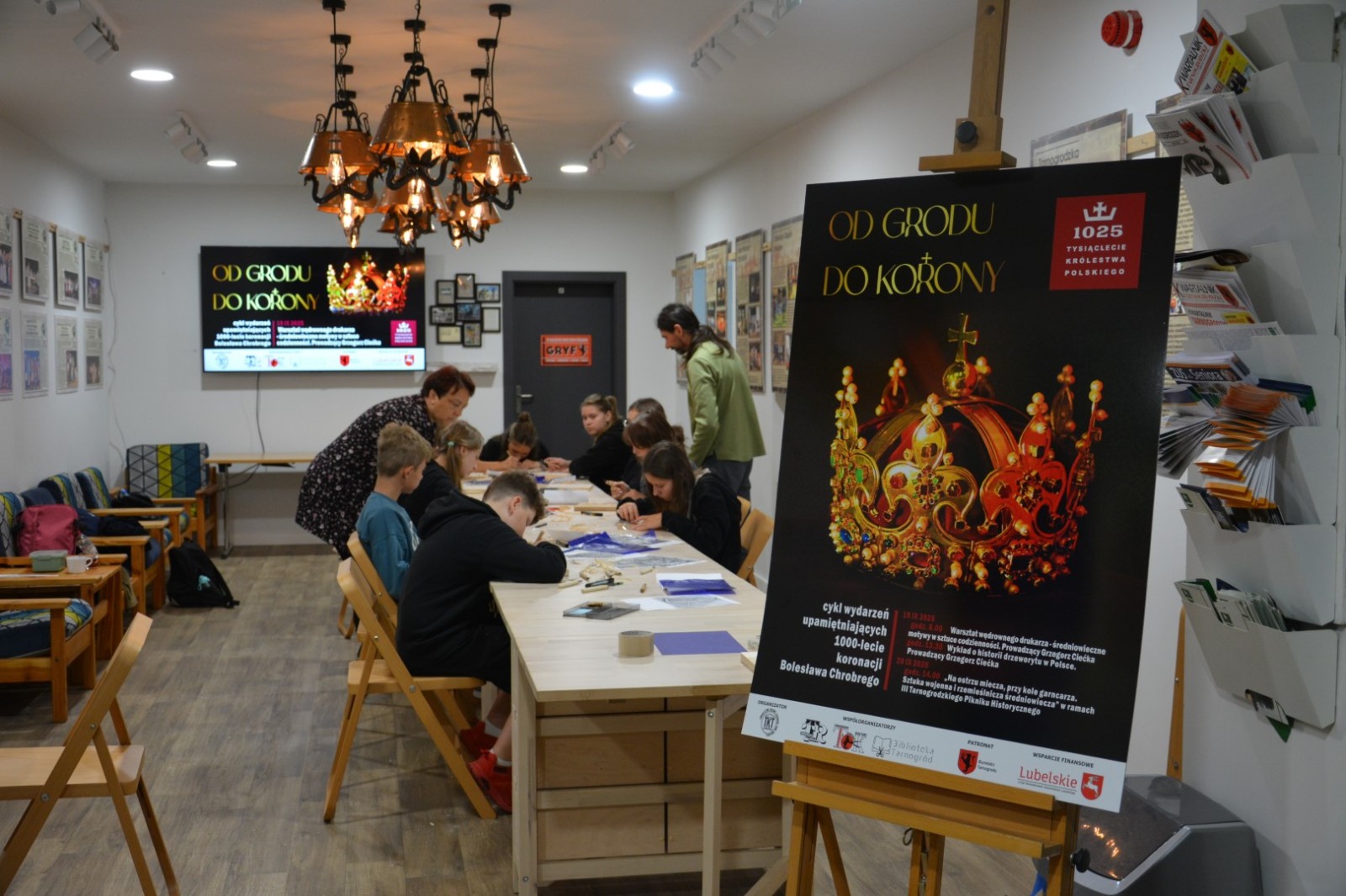 19 września 2025r. Tarnogrodzki Ośrodek Kultury gościł wyjątkowego artystę, Grzegorza Ciećkę, specjalizującego się w drzeworycie ludowym i zadruku tkanin, który zapoznał młodzież z tradycyjną sztuką drzeworytniczą w ramach projektu "1000-lecie koronacji Bolesława Chrobrego"